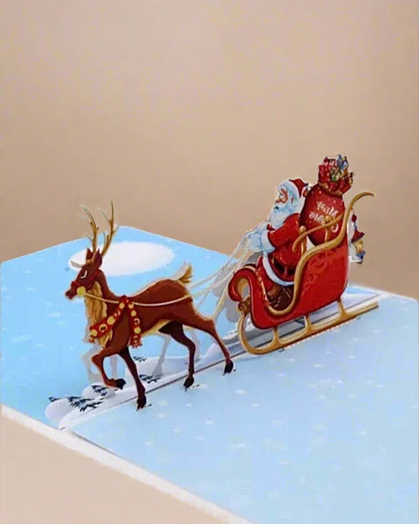 Why give an ordinary card when you can give a moment of wonder? Elevate your holiday gifting with this elegant 3D pop-up card, featuring a beautifully laser-cut Santa Claus on his sleigh, gliding through a festive scene. Measuring approximately 6 x 6 inches, this square card is a refined complement to any holiday gift.